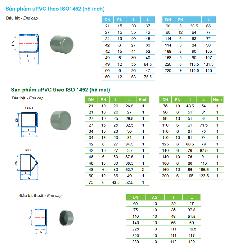 Thông số kỹ thuật Đầu bịt PVC Tiền Phong