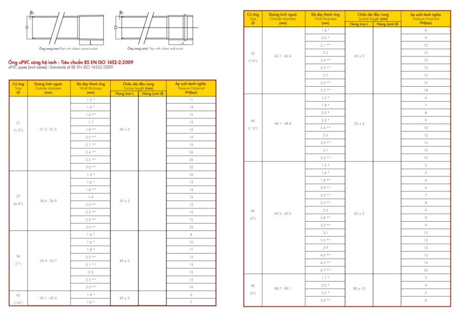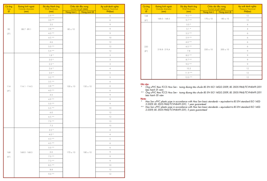 - Ống Nhựa PVC Hoa Sen được sản xuất theo tiêu chuẩn ISO 1452:2009 hệ Mét và tiêu chuẩn BS END ISO 1452:2009 hệ Inch, sản phẩm có đường kính 21mm đến 800mm, có thể làm việc với nhiệt độ từ 0 đến ≤ 45°C, Ống và phụ kiện uPVC cứng được sản xuất từ hợp chất nhựa PVC không hóa dẻo