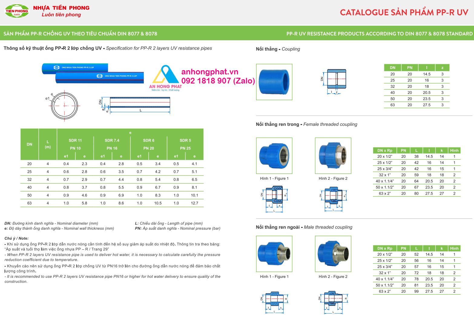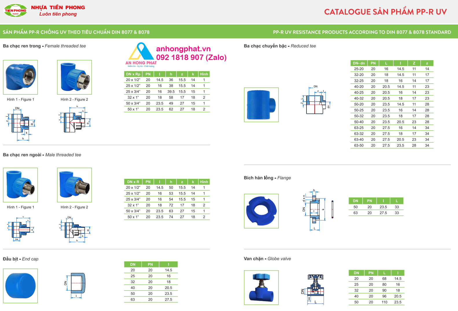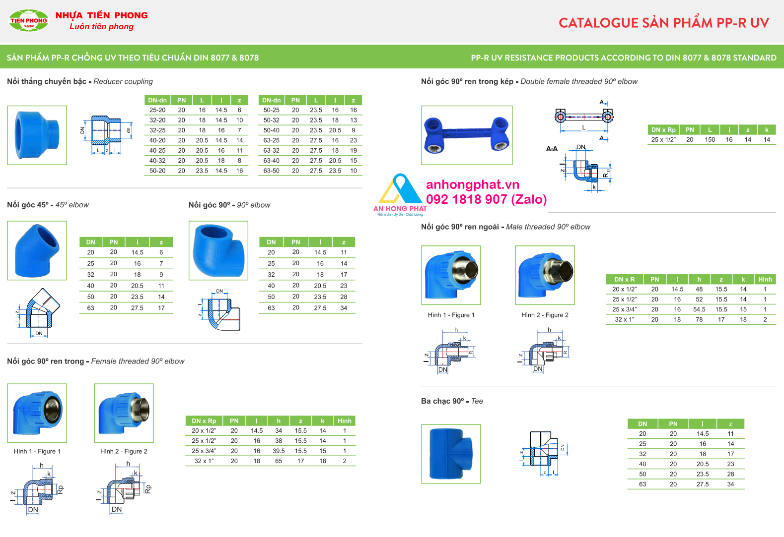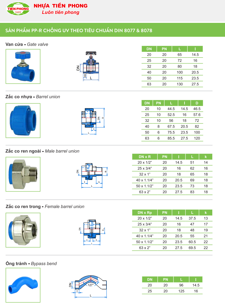 Phụ Kiện PPR UV Tiền Phong (chống nắng) tiêu chuẩn DIN 8077&8078 / PPR PIPES - DIN 8077&8078. Có đường kính sản phẩm từ 20mm đến 63mm, Được sản xuất từ hợp chất nhựa Polypropylene Copolymer, PP-R 80, nhiệt độ làm việc từ 0 đến 95 0C, có khả năng chống nắng ưu việt so với các loại ống PPR thông thường, đáp ứng mục tiêu kéo dài tuổi thọ khi sử dụng ống trực tiếp dưới ánh sáng mặt trời.